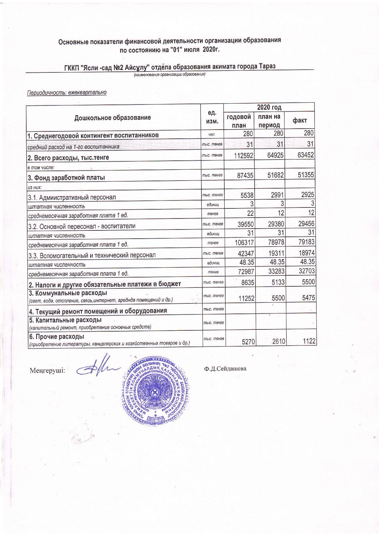 Основные показатели финансовой деятельности на 01.07.2020 » №2 "Айсұлу" бөбекжай-бақшасы"